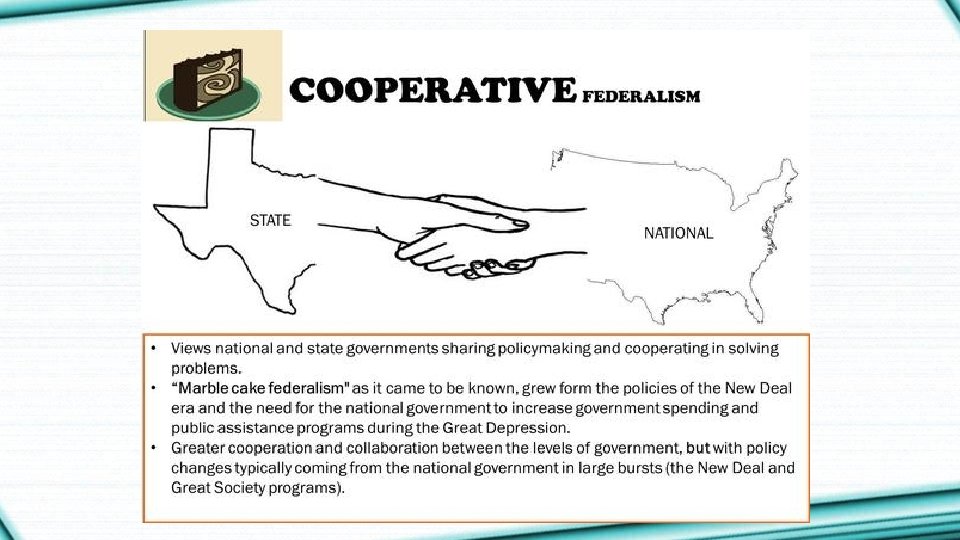 Cooperative Federalism: A Marble Cake of Mixed Powers • The Great Depression of the 1930 s led to a different conception of federalism. • As the Depression deepened, the efforts of state governments to feed the hungry and revive the economy proved inadequate. • In desperation, Americans turned to the national government for help. • In 1933, President Roosevelt launched legislation called the New Deal, marking the beginning of new era of shared power among the national, state, and local governments; working together as allies.
