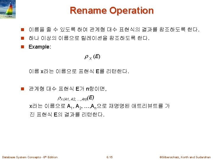 복합 연산 (Composition of Operations) n 여러 연산을 사용해 표현식을 만들 수 있다. n Example: A=C(r x s) n rxs n A=C(r x s) Database System Concepts - 6 th Edition 6. 14 ©Silberschatz, Korth and Sudarshan