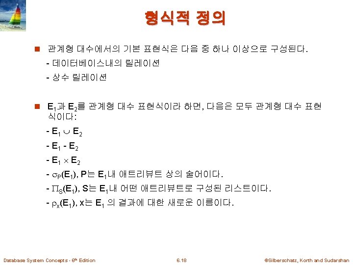 예제 질의 n 물리학과 (Physics department)에 소속된 강사 ID와, 이 들 강사가 가르친 모 든 course_id 를 찾으시오. l Query 1 instructor. ID, course_id ( dept_name=“Physics” ( instructor. ID=teaches. ID (instructor x teaches))) l Query 2 instructor. ID, course_id ( instructor. ID=teaches. ID ( dept_name=“Physics” (instructor) x teaches)) Database System Concepts - 6 th Edition 6. 17 ©Silberschatz, Korth and Sudarshan