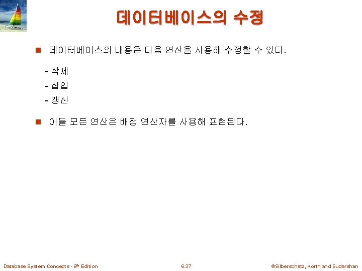 Chapter 6: 정규 관계형 질의 언어 n Relational Algebra (관계 대수언어) n Tuple Relational Calculus (튜플 관계 해석) n Domain Relational Calculus (도메인 관계 해석) Database System Concepts - 6 th Edition 6. 2 ©Silberschatz, Korth and Sudarshan