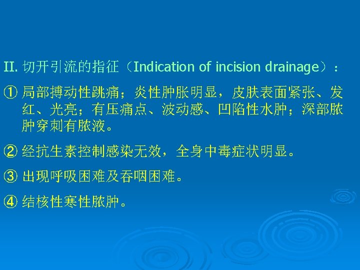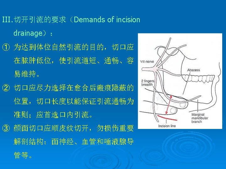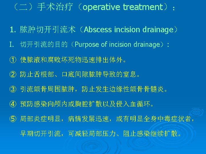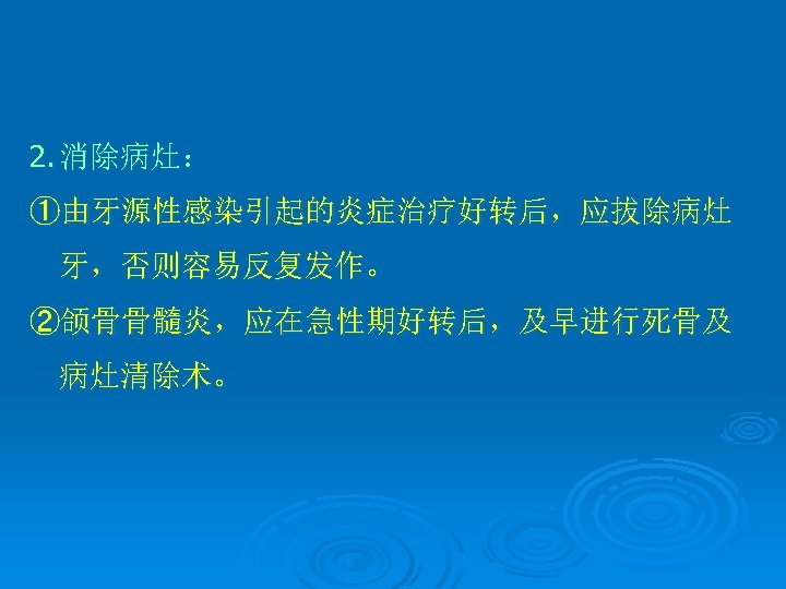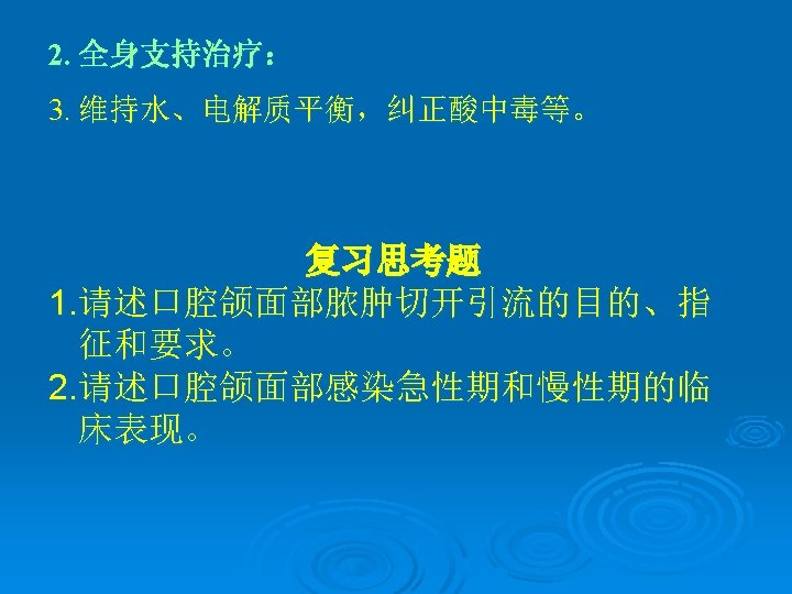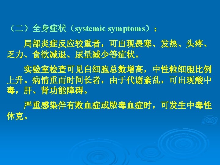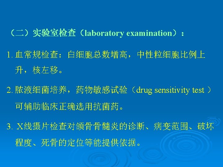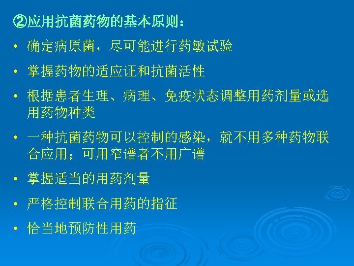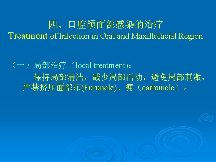 (三)全身治疗(General treatment): 1. 抗菌药物治疗(antibacterial therapy) ①应用抗菌药物指征: • 感染病原为细菌(the infection is of bacterial origin) • 有明显的局部淋巴结肿痛或发热等全身反应(there is significant regional lymph node or systemic reactions, ie. body temperature is raised) • 感染扩散迅速(spread is significant) • 局部治疗无效(appropriate local treatment has not been succesful) • 患者抵抗力下降(resistance is reduced)