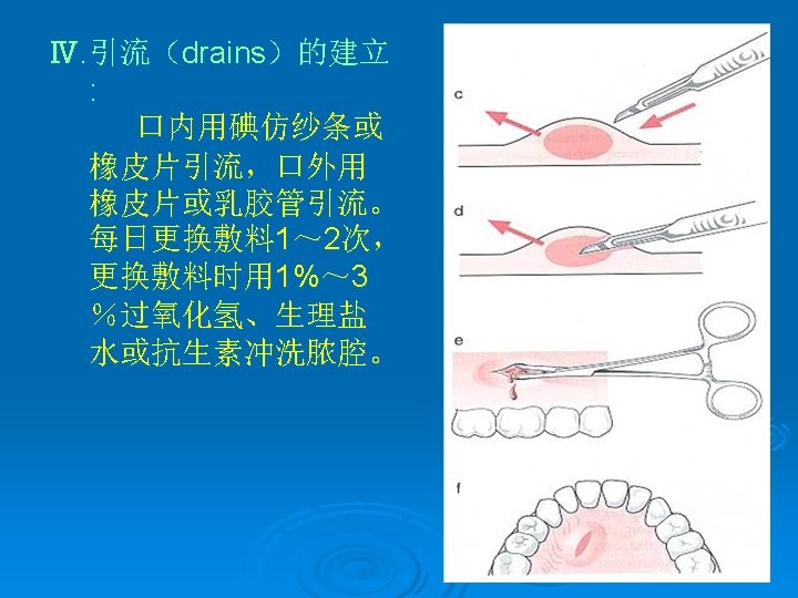 Surgical Treatment Provide drainage Ø Remove the cause of infection Ø l l Ø Pulpectomy Extraction Remove foreign body Debride non-viable bone Culture and sensitivity