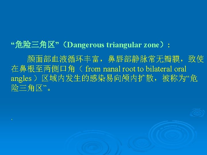 一、口腔颌面部感染的途径及病原菌 Pathways and Pathogens of Infection in Oral and Maxillofacial Regions (一)口腔颌面部感染的途径 1. 牙源性(Dental genetic) 2. 腺源性(Adenoid genetic) 3. 损伤性(Injury genetic) 4. 血源性(Hemal genetic) 5. 医源性(Iatrogenic)