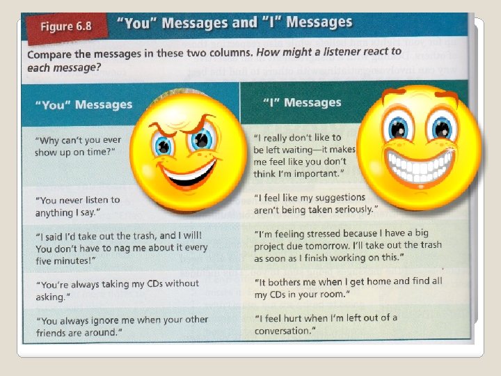SPEAKING SKILLS Types of Messages You messages – blaming or shaming express “You never let me do anything” I messages – healthful “I wish you could trust me enough to allow me to do things”