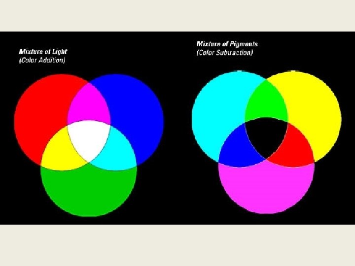 Additive Process • Colored Light behaves and mixes differently than the subtractive process. • The Primary Colors of the additive Process are Red, Green, and Blue. • The secondary colors are yellow, magenta, and cyan. Our most common exposure to the additive process is when we look at television or computer screens (old screens, when seen close up, are comprised of tiny red, green, and blue dots). When more colors are added to one another, they become stronger and brighter than when they stand alone. When you look through the other side of the prism, the colors all join to create white, and hence, the additive process.