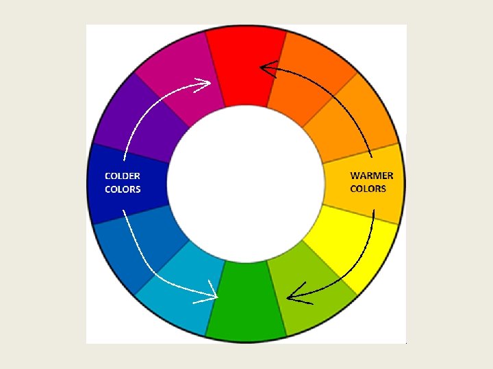 Intermediate Colors (in the Subtractive Process) • • • Yellow-Orange Yellow-Green Blue-Violet Red-Orange The intermediate colors are made by mixing a primary with a secondary color. Note how all the names begin with the primary color.