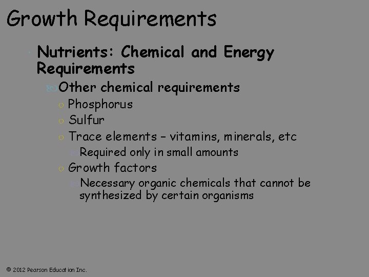 Growth Requirements Nutrients: Chemical and Energy Requirements Other chemical requirements ○ Phosphorus ○ Sulfur ○ Trace elements – vitamins, minerals, etc Required only in small amounts ○ Growth factors Necessary organic chemicals that cannot be synthesized by certain organisms © 2012 Pearson Education Inc.