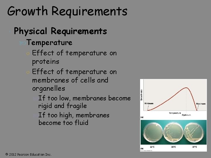 Growth Requirements Physical Requirements Temperature ○ Effect of temperature on proteins ○ Effect of temperature on membranes of cells and organelles If too low, membranes become rigid and fragile If too high, membranes become too fluid © 2012 Pearson Education Inc.