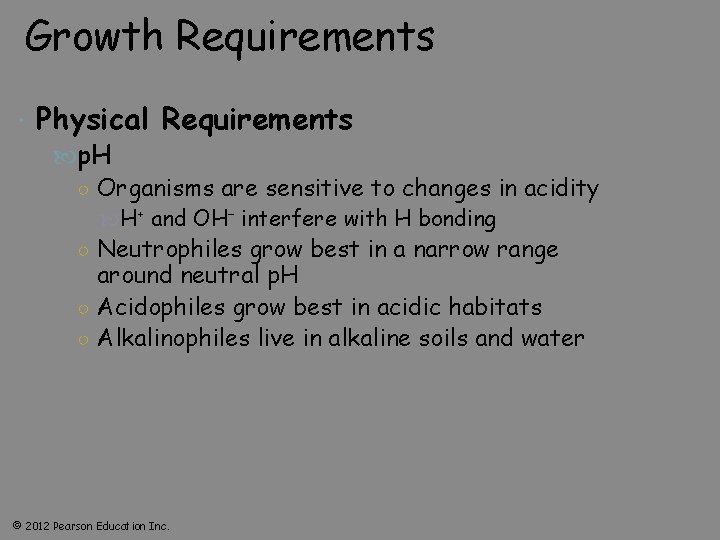 Growth Requirements Physical Requirements p. H ○ Organisms are sensitive to changes in acidity H+ and OH– interfere with H bonding ○ Neutrophiles grow best in a narrow range around neutral p. H ○ Acidophiles grow best in acidic habitats ○ Alkalinophiles live in alkaline soils and water © 2012 Pearson Education Inc.
