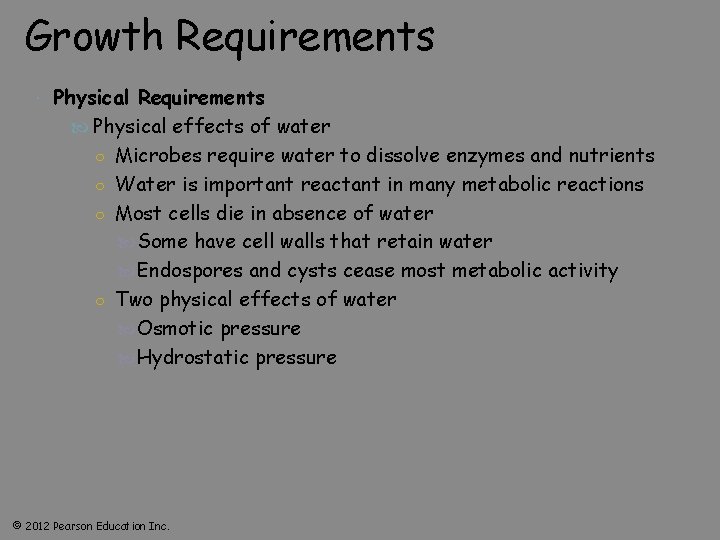 Growth Requirements Physical effects of water ○ Microbes require water to dissolve enzymes and nutrients ○ Water is important reactant in many metabolic reactions ○ Most cells die in absence of water Some have cell walls that retain water Endospores and cysts cease most metabolic activity ○ Two physical effects of water Osmotic pressure Hydrostatic pressure © 2012 Pearson Education Inc.