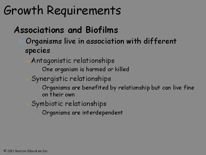 Growth Requirements Associations and Biofilms Organisms live in association with different species ○ Antagonistic relationships - One organism is harmed or killed ○ Synergistic relationships - Organisms are benefited by relationship but can live fine on their own ○ Symbiotic relationships - Organisms are interdependent © 2012 Pearson Education Inc.