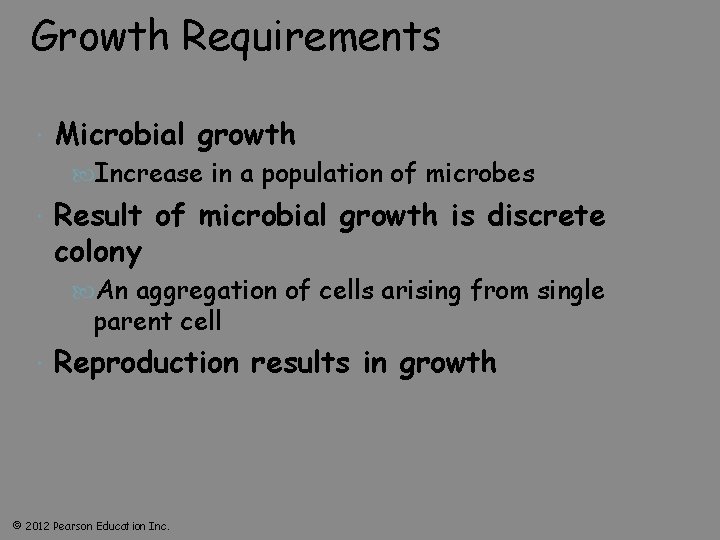Growth Requirements Microbial growth Increase in a population of microbes Result of microbial growth is discrete colony An aggregation of cells arising from single parent cell Reproduction results in growth © 2012 Pearson Education Inc.