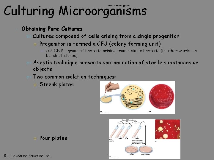 Culturing Microorganisms Figure 6. 10 Pour plate method of isolation-overview Obtaining Pure Cultures composed of cells arising from a single progenitor ○ Progenitor is termed a CFU (colony forming unit) COLONY – group of bacteria arising from a single bacteria (in other words – a bunch of clones) Aseptic technique prevents contamination of sterile substances or objects Two common isolation techniques: ○ Streak plates ○ Pour plates © 2012 Pearson Education Inc.