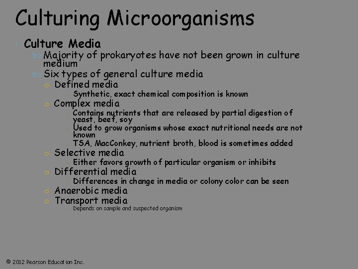 Culturing Microorganisms Culture Media Majority of prokaryotes have not been grown in culture medium Six types of general culture media ○ Defined media - Synthetic, exact chemical composition is known ○ Complex media - Contains nutrients that are released by partial digestion of yeast, beef, soy - Used to grow organisms whose exact nutritional needs are not known - TSA, Mac. Conkey, nutrient broth, blood is sometimes added ○ Selective media - Either favors growth of particular organism or inhibits ○ Differential media - Differences in change in media or colony color can be seen ○ Anaerobic media ○ Transport media - Depends on sample and suspected organism © 2012 Pearson Education Inc.