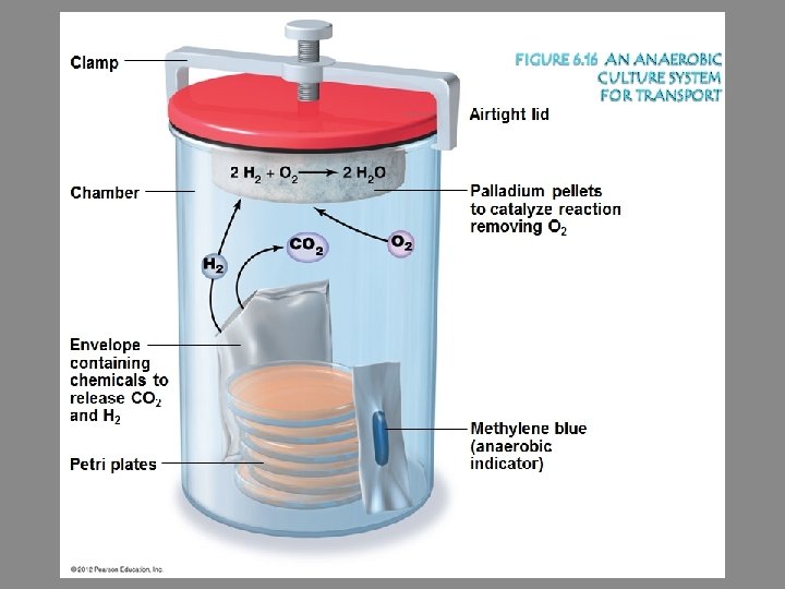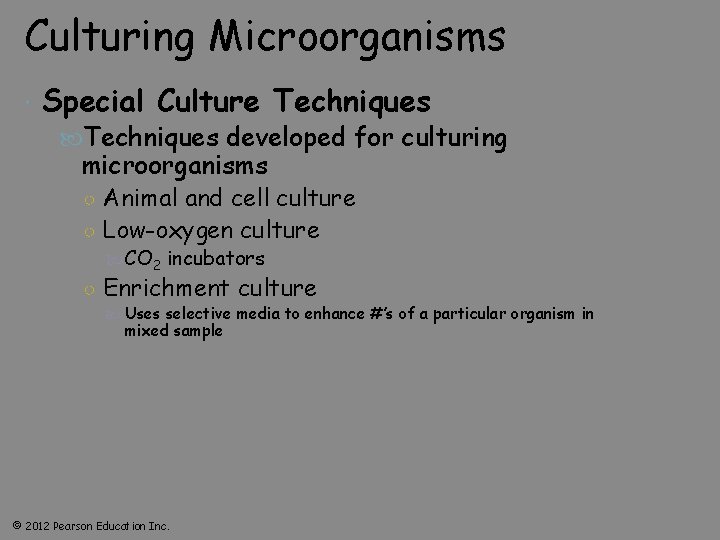 Culturing Microorganisms Special Culture Techniques developed for culturing microorganisms ○ Animal and cell culture ○ Low-oxygen culture CO 2 incubators ○ Enrichment culture Uses selective media to enhance #’s of a particular organism in mixed sample © 2012 Pearson Education Inc.