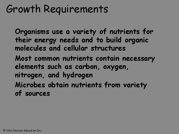Growth Requirements Organisms use a variety of nutrients for their energy needs and to build organic molecules and cellular structures Most common nutrients contain necessary elements such as carbon, oxygen, nitrogen, and hydrogen Microbes obtain nutrients from variety of sources © 2012 Pearson Education Inc.