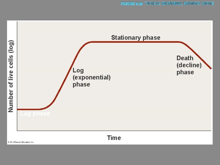 Number of live cells (log) FIGURE 6. 20 TYPICAL MICROBIAL GROWTH CURVE Stationary phase Log (exponential) phase Lag phase Time Death (decline) phase