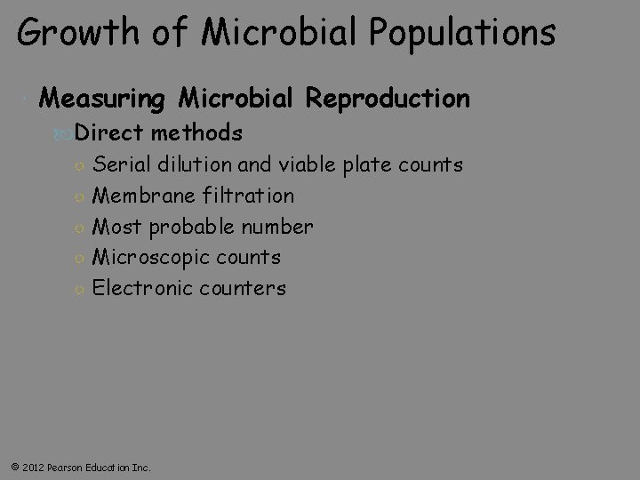 Growth of Microbial Populations Measuring Microbial Reproduction Direct methods ○ Serial dilution and viable plate counts ○ Membrane filtration ○ Most probable number ○ Microscopic counts ○ Electronic counters © 2012 Pearson Education Inc.