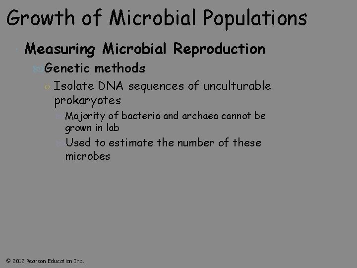 Growth of Microbial Populations Measuring Microbial Reproduction Genetic methods ○ Isolate DNA sequences of unculturable prokaryotes Majority of bacteria and archaea cannot be grown in lab Used to estimate the number of these microbes © 2012 Pearson Education Inc.