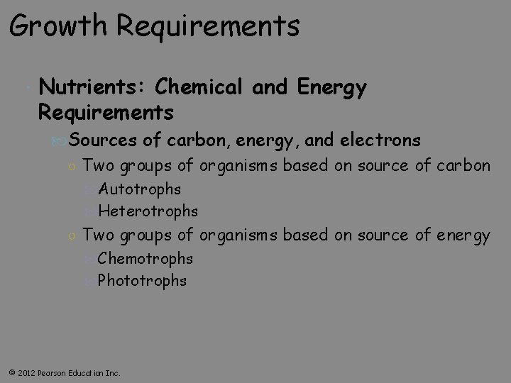 Growth Requirements Nutrients: Chemical and Energy Requirements Sources of carbon, energy, and electrons ○ Two groups of organisms based on source of carbon Autotrophs Heterotrophs ○ Two groups of organisms based on source of energy Chemotrophs Phototrophs © 2012 Pearson Education Inc.