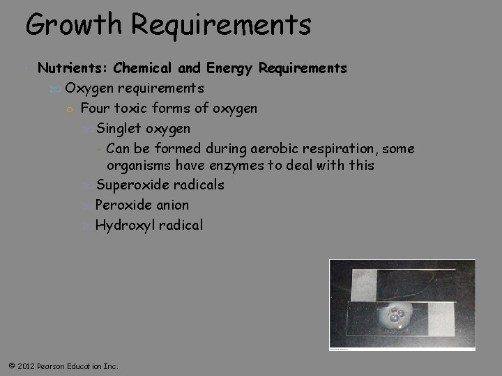 Growth Requirements Nutrients: Chemical and Energy Requirements Oxygen requirements ○ Four toxic forms of oxygen Singlet oxygen - Can be formed during aerobic respiration, some organisms have enzymes to deal with this Superoxide radicals Peroxide anion Hydroxyl radical © 2012 Pearson Education Inc.