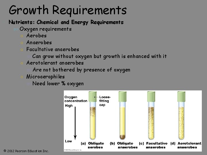 Growth Requirements Nutrients: Chemical and Energy Requirements Oxygen requirements ○ Aerobes ○ Anaerobes ○ Facultative anaerobes Can grow without oxygen but growth is enhanced with it ○ Aerotolerant anaerobes Are not bothered by presence of oxygen ○ Microaerophiles Need lower % oxygen © 2012 Pearson Education Inc.