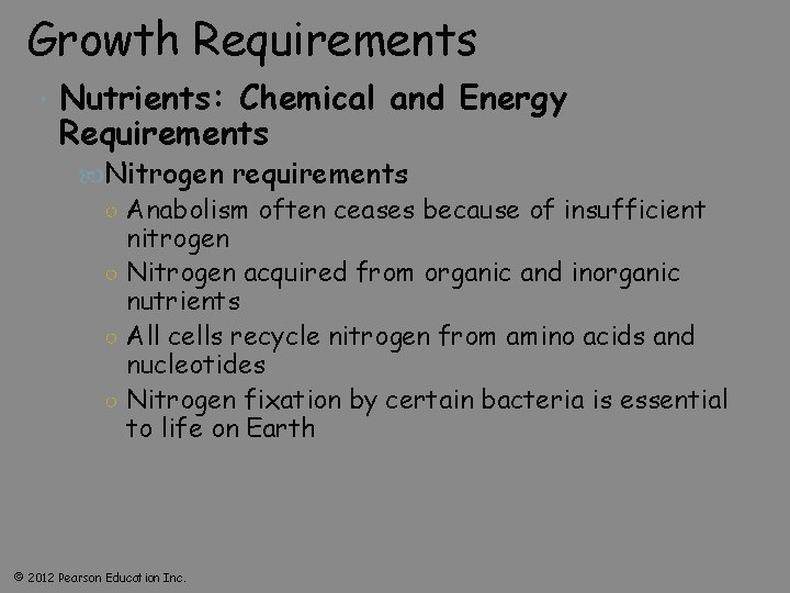Growth Requirements Nutrients: Chemical and Energy Requirements Nitrogen requirements ○ Anabolism often ceases because of insufficient nitrogen ○ Nitrogen acquired from organic and inorganic nutrients ○ All cells recycle nitrogen from amino acids and nucleotides ○ Nitrogen fixation by certain bacteria is essential to life on Earth © 2012 Pearson Education Inc.