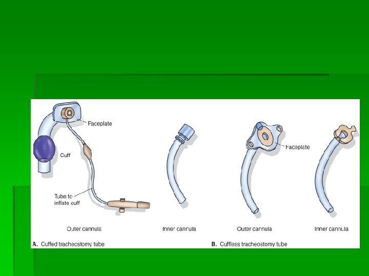 Trach tubes § made of plastic or metal and consists of three parts § vary depending on their function and need of the pt § outer cannula-secured in place by ties or a Velcro collar around the neck § never removed § inner cannula-inserted through the outer and locked into place § removed for cleaning and mucus removal for patency § obturator-used to insert the outer cannula, then removed § taped to wall or bedside table incase outer cannula comes out