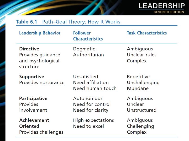 Overview ÷ Path–Goal Theory Perspective ÷ Conditions of Leadership Motivation ÷ Leader Behaviors & Follower Characteristics ÷ Task Characteristics ÷ How Does PGT Work? Peter G. Northouse, Leadership: Theory and Practice, Seventh Edition. © 2016 SAGE Publications, Inc.