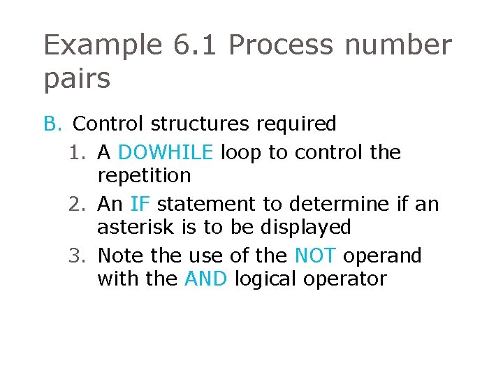 Example 6. 1 Process number pairs B. Control structures required 1. A DOWHILE loop to control the repetition 2. An IF statement to determine if an asterisk is to be displayed 3. Note the use of the NOT operand with the AND logical operator
