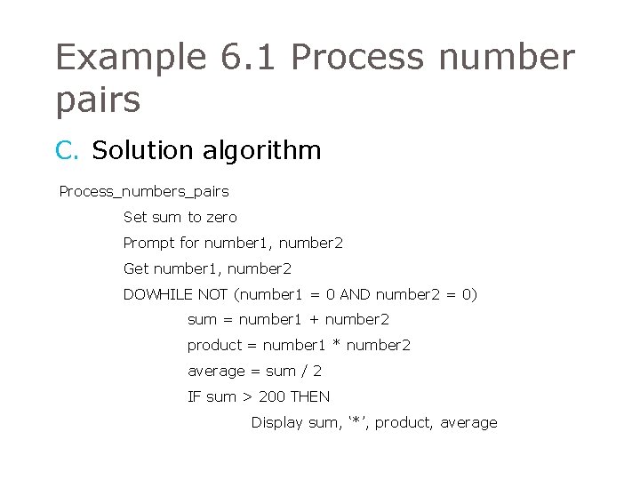 Example 6. 1 Process number pairs C. Solution algorithm Process_numbers_pairs Set sum to zero Prompt for number 1, number 2 Get number 1, number 2 DOWHILE NOT (number 1 = 0 AND number 2 = 0) sum = number 1 + number 2 product = number 1 * number 2 average = sum / 2 IF sum > 200 THEN Display sum, ‘*’, product, average