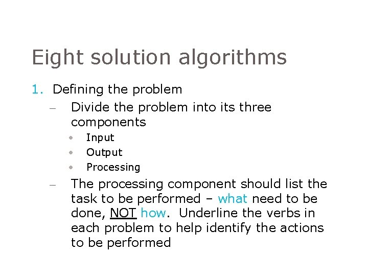Eight solution algorithms 1. Defining the problem – Divide the problem into its three components • • • – Input Output Processing The processing component should list the task to be performed – what need to be done, NOT how. Underline the verbs in each problem to help identify the actions to be performed