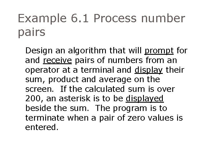 Example 6. 1 Process number pairs Design an algorithm that will prompt for and receive pairs of numbers from an operator at a terminal and display their sum, product and average on the screen. If the calculated sum is over 200, an asterisk is to be displayed beside the sum. The program is to terminate when a pair of zero values is entered.