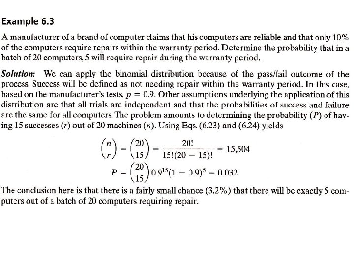 6. 3. 2 Some Probability Distribution Functions with Engineering Applications Binomial Distribution The binomial distribution is a distribution which describes discrete random variables that can have only two possible outcomes: "success" and "failure. " This distribution has application in production quality control, when the quality of a product is either acceptable or unacceptable. The following conditions need to be satisfied for the binomial distribution to be applicable to a certain experiment: 1. Each trial in the experiment can have only the two possible outcomes of success or failure. 2. The probability of success remains constant throughout the experiment. This probability is denoted by p and is usually known or estimated for a given population. 3. The experiment consists of n independent trials. The expected number of successes in n trials for binomial distribution is The standard deviation of the binomial distribution is