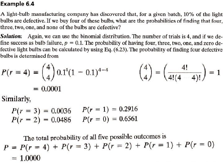 Example 6. 5 For the data of Example 6. 4, calculate the probability of finding up to and including two defective light bulbs in the sample of four. Solution: We use E, q. (6. 21) for this purpose: