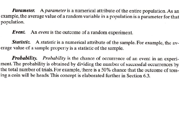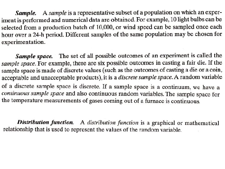 • To apply statistical analysis to experimental data, the data are usually characterized by determining parameters that specify the central tendency and the dispersion of the data. • The next step is to select a theoretical distribution function that is most suitable for explaining the behavior of the data. The theoretical function can then be used to make predictions about various properties of the data. GENERAL CONCEPTS AND DEFINITIONS Population. The population comprises the entire collection of objects, measurements, observations, and so on whose properties are under consideration and about which some generalizations are to be made. Examples of population are the entire set of 60 -W electric bulbs that have been produced in a production batch and values of wind speed at a certain point over a defined period of time.