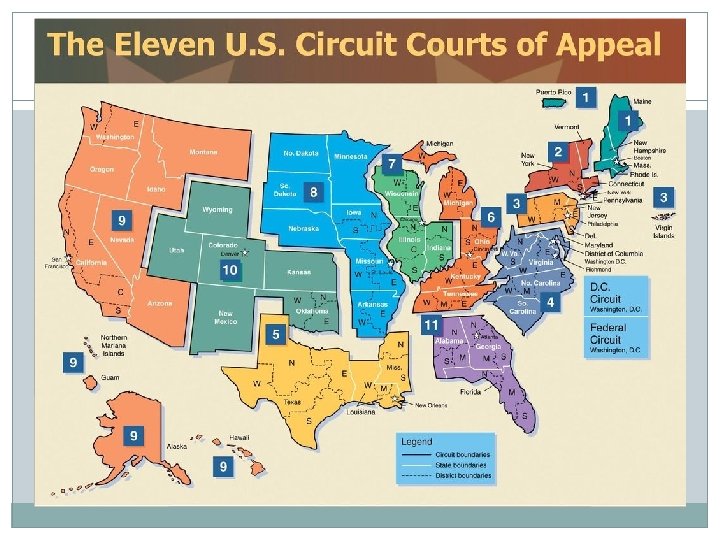 U. S. Circuit Courts of Appeals �Appellate jurisdiction Petitioner must show violation of law/procedure by lower court Panel of judges, no witnesses, no jury, no factual determination Shape body of U. S. law � 1891 – Congress makes permanent: judges � 11 geographic circuits � 2 other appeals courts: Circuit Court for Federal Circuit – patents, contracts, claims v U. S. Circuit Court of Appeals for D. C. – appeals from those fined by regulatory agencies – feeder for S. Ct. justices � 200 justices (panels of three) Sometimes en banc (all justices in circuit hear the appeal)