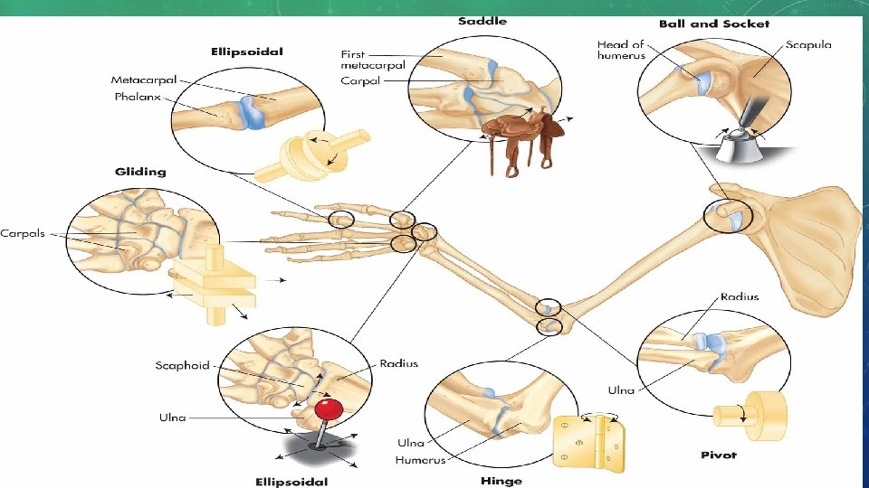 JOINTS AND LIGAMENTS • Types of synovial joints • Pivot joint: turnstile movement in neck and forearm • Ball and socket joint: hip and shoulder; all forms of movement, including rotation • Hinge joint: allow opening and closing movement in knees and elbows • Gliding joint: wrists and ankles; provides sliding back and forth movement • Saddle joint: shaped like saddle, found in thumb; can rock up and down or side to side • Condyloid joint: oval shaped bone end fitting into elliptical cavity in other bone so there is movement from one plane to another but no rotation as found in fingers and toes. Provide two axes of movement through same bone like joint formed at wrist with radius and ulna