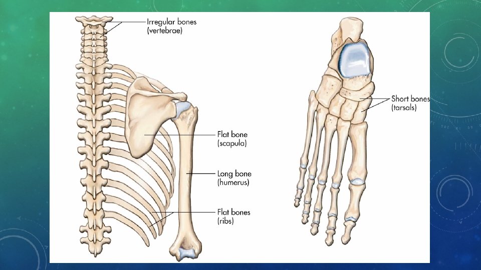 BONE CLASSIFICATION • Long bones: longer than they are wide and can be found in arms and legs • Short bones: fairly equal in width and length and found mostly in wrists and ankles • Flat bones: thinner and can be either flat or curved; can be plate-like in nature and would include skull, ribs, and sternum (breast bone) • Irregular bones: like parts of jigsaw puzzle, odd in shape, and include hip bone and vertebrae