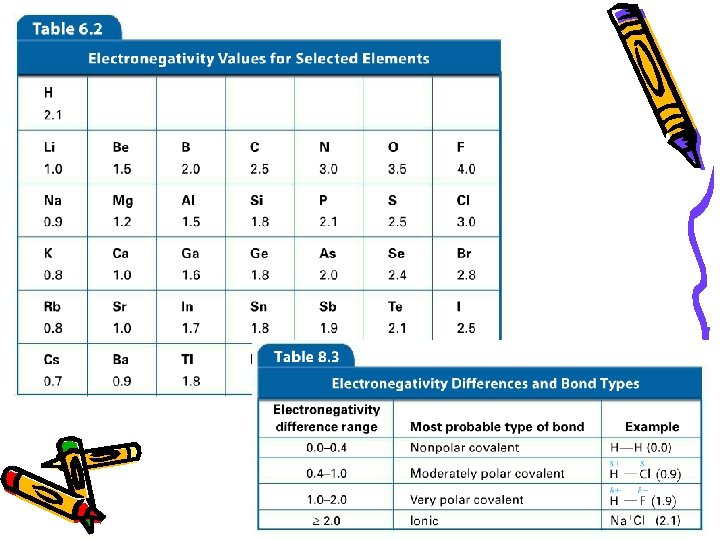 ● The electronegativity (attraction for an electron) of atoms can be used to predict the type of bond that will form. Bond Type Electronegativity Difference Typically Ionic Large (2. 0+) Metal + Nonmetal Covalent (Polar) Medium (0. 4 -2. 0) Nonmetal + Nonmetal Covalent (Nonpolar) Small (0 -0. 4) Nonmetal + Nonmetal Metallic Not Applicable Metals