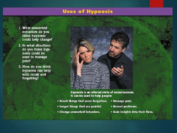 Section 2: Hypnosis, Biofeedback, Hypnosis is a form of altered consciousness in which people become highly suggestible to changes in behavior and thought. and. Participants Meditation are NOT put to sleep – it is a form of trance. Hypnosis has uses in medical and therapeutic settings. Memory can be aided or enhanced Pain can be eliminated or reduced Problems can be revealed and insight gained