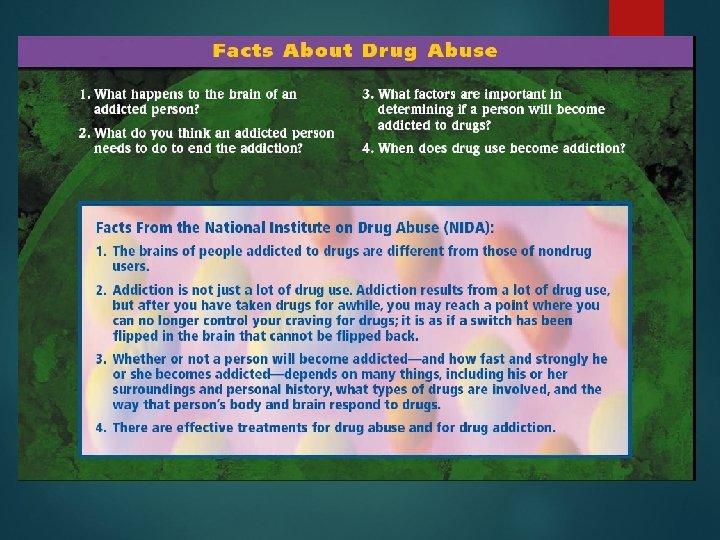Drug Abuse and Treatment Drug abusers are people who regularly use illegal drugs or excessively use legal drugs. Risks of abuse are danger of death or injury, damage to health, legal consequences, destructive behavior, and loss of control. Treatment requires the individual to 1) admit they have a problem 2) enter a treatment program or get therapy 3) join a support group to help reduce the possibility of a relapse.