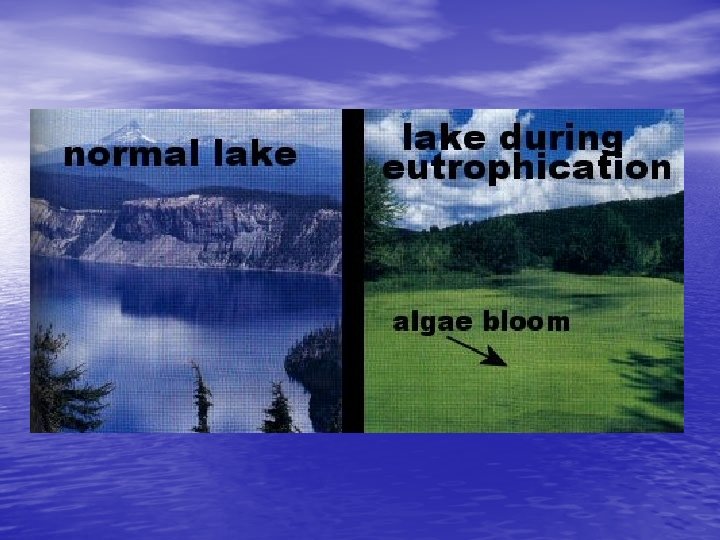 How Nutrients Affect Lakes • A lake that has large amounts of plant • growth due to nutrients is known as a eutrophic lake. Lakes naturally become eutrophic over a long period of time, however, eutrophication can be accelerated by runoff, such as rain, that can carry sewage, fertilizers, or animal wastes from land into bodies of water.