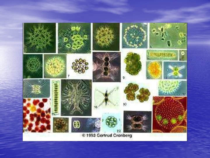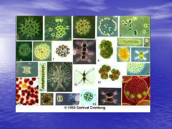 Plankton – drifters; cannot swim • Phytoplankton: plant-like plankton • Base for most aquatic food chains. • Carry out the bulk of photosynthesis on Earth and provide most of the oxygen. • 70% of oxygen you breath can be traced back to phytoplankton • Examples: algae