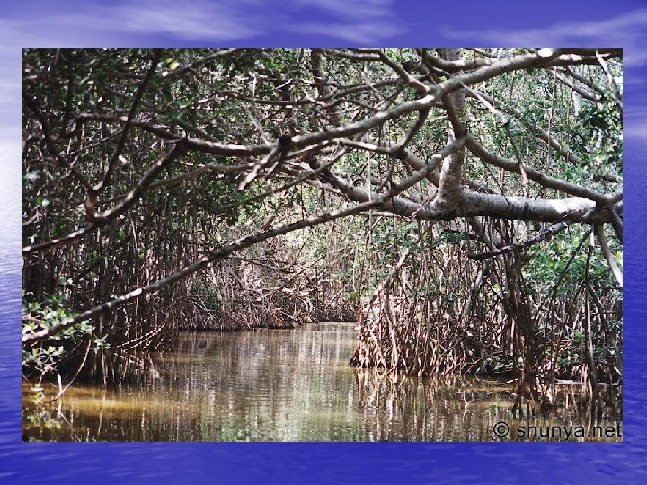 Mangrove Swamps • tropical or subtropical marine swamps that are characterized by the abundance mangrove trees. • protect the coastline from erosion and reduce the damage from storms; provide a home for about 2, 000 animal species. • Many have been filled with waste and destroyed in many parts of the world.