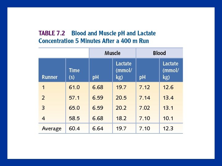 Respiratory Regulation of Acid–Base Balance • • Normal Ph is slightly alkaline: 7. 1 (muscle), 7. 4 (blood) Lactic acid releases H+ (hydrogen ions) H+ + buffer → H-buffer Examples of buffers: – Bicarbonate: combines w/ H+ , forms carbonic acid, which forms CO 2 & water @ the lungs – Phosphate: in muscles & kidneys (excreted in urine) – Proteins – Hemoglobin • Acidosis: H+ concentration above normal • Alkalosis: H+ concentration below normal