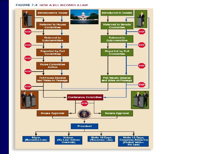 How a Bill Becomes a Law: Textbook Version o In the Senate, bill may be held up by: n A hold – a tactic by which a senator asks to be informed before a particular bill is brought to the floor n A filibuster – a formal way of halting action on a bill by means of long speeches or unlimited debate on the Senate o Cloture: Mechanism requiring sixty senators to vote to cut off debate