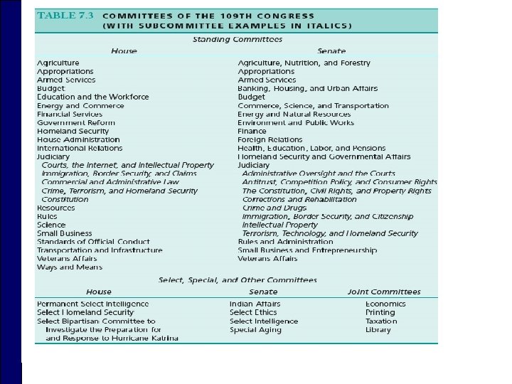 Committee System o o Standing Committees n Continue from one Congress to the next—bills referred here for consideration n Powerful n Discharge petitions Joint Committees n Includes members from both houses of Congress, conducts investigations or special studies Conference Committees n Joint committee created to iron out differences between Senate and House versions of a specific piece of legislation Select (or special) Committees n Temporary committee appointed for specific purpose, such as conducting a special investigation or study