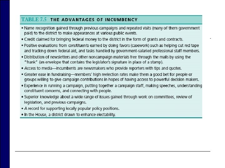 Running for Office and Staying in Office o Incumbency n The fact that being in office helps a person stay in office because of a variety of benefits that go with the position o Name recognition o Access to free media o Inside track on fund-raising o District drawn to favor incumbent n 1980 to 1990, an average of 95 percent of incumbents who sought reelection won their primary and general election races.