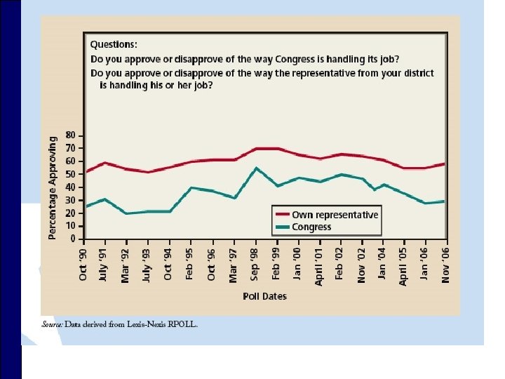 Theories of Representation o Trustee n Role played by elected representatives who listen to constituent’s opinions and then use their best judgment to make final decisions o Delegate n Role played by elected representatives who vote the way their constituents would want them to, regardless of their own opinions o Politico n Role played by elected representatives who act as trustees or as delegates, depending on the issue